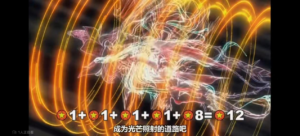 这些星星在光圈内连成直线,最终发出强光并显现出由二者等级相加合成的12星同调大怪——蛇精!