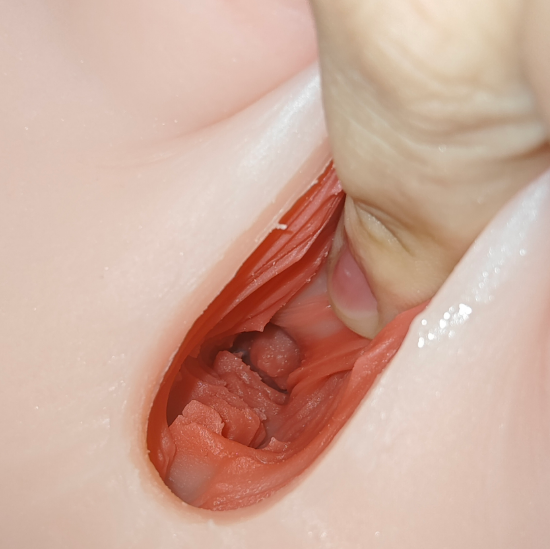 后部通道内部的结构则像一片片柔软的肉片,类似牙刷刷过般的连续刺激;同时包裹感强、有一定吸力,甚至手指放入后拔出都需稍用些力
