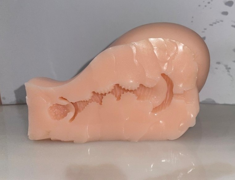 到中间通道部分,中间通道采用了横纹褶皱来模仿真实的腔内构造,三对凸起的大肉球在中间,让通道猛然收紧,来模拟出突破感,而后段做了一个子宫设计,里面有颗粒状的突起,是对头头最后的按摩刺激。