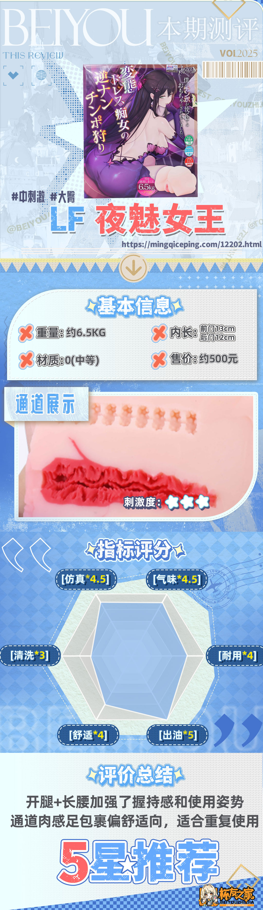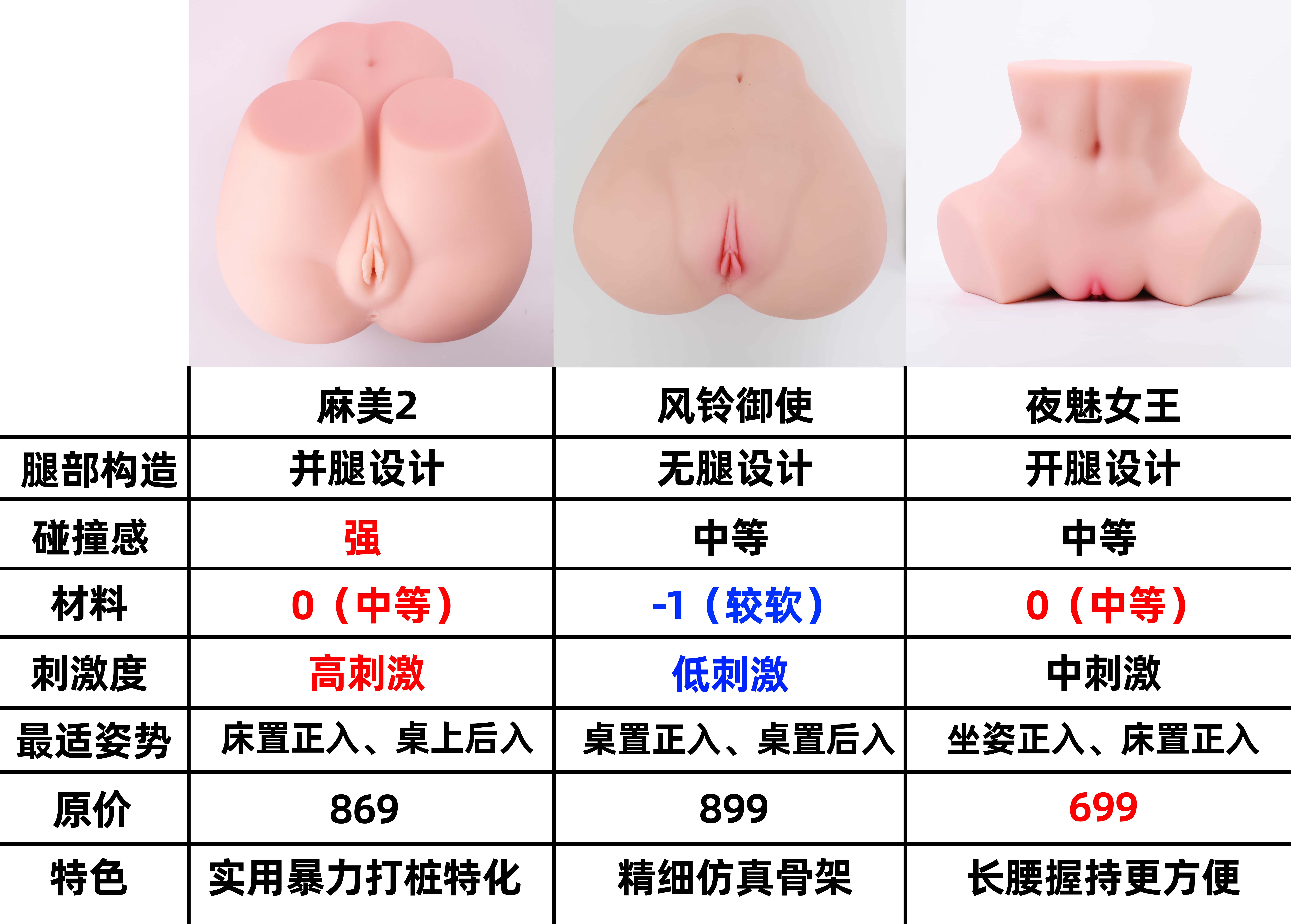 而这次的夜魅女王,主打的方向无疑就是姿势以及握持方面的更强兼容——你可以说后入以及碰撞感不如麻美,和风铃相比也并没有那么慢玩仿真;不过开腿结构+长腰握持设计确实让一款大臀的使用变得轻松多了,即便是新手上来各种姿势一套输出也能玩的很爽。另外这次的通道也更有诚意,复用性和舒适度都有保证,结合更加便宜的价格,给到5星推荐
