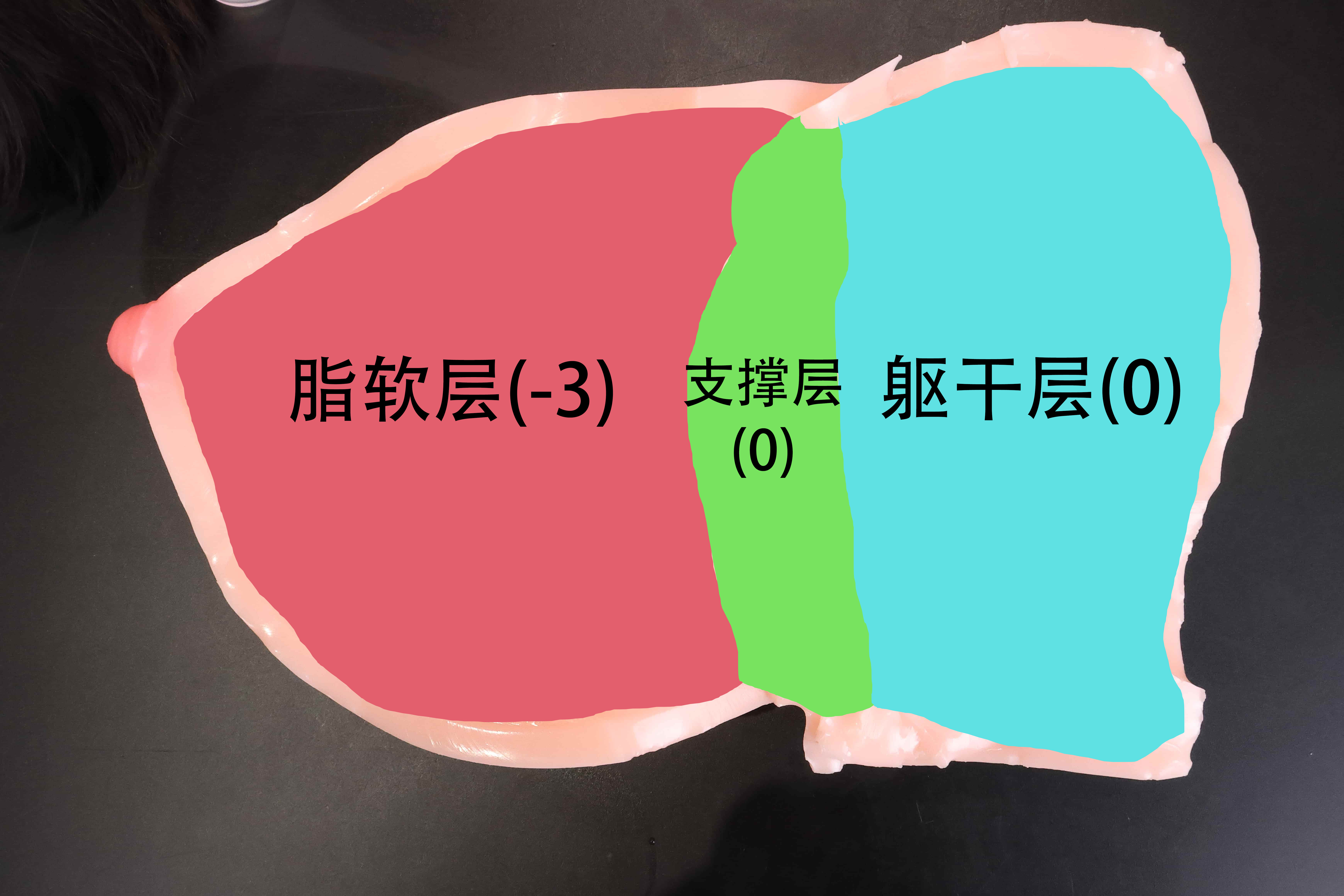 牢牛还是做个图说明一下究竟怎么立起来的——主要就是躯干部分底部有个椭圆形的0级硬度底座(红色),然后软奈子辅助提供支撑(紫色),算是一个标准的三角稳定结构