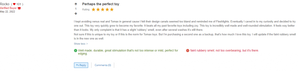 外观仿真度(2星X2分)+气味大小(5星X2分)+出油程度(5星X2分)+耐用度(3星X2分)+清洗难易度(4星X2分)+体验(4星X10分)=78分 四星推荐级别,敏感新手的话则是五星推荐