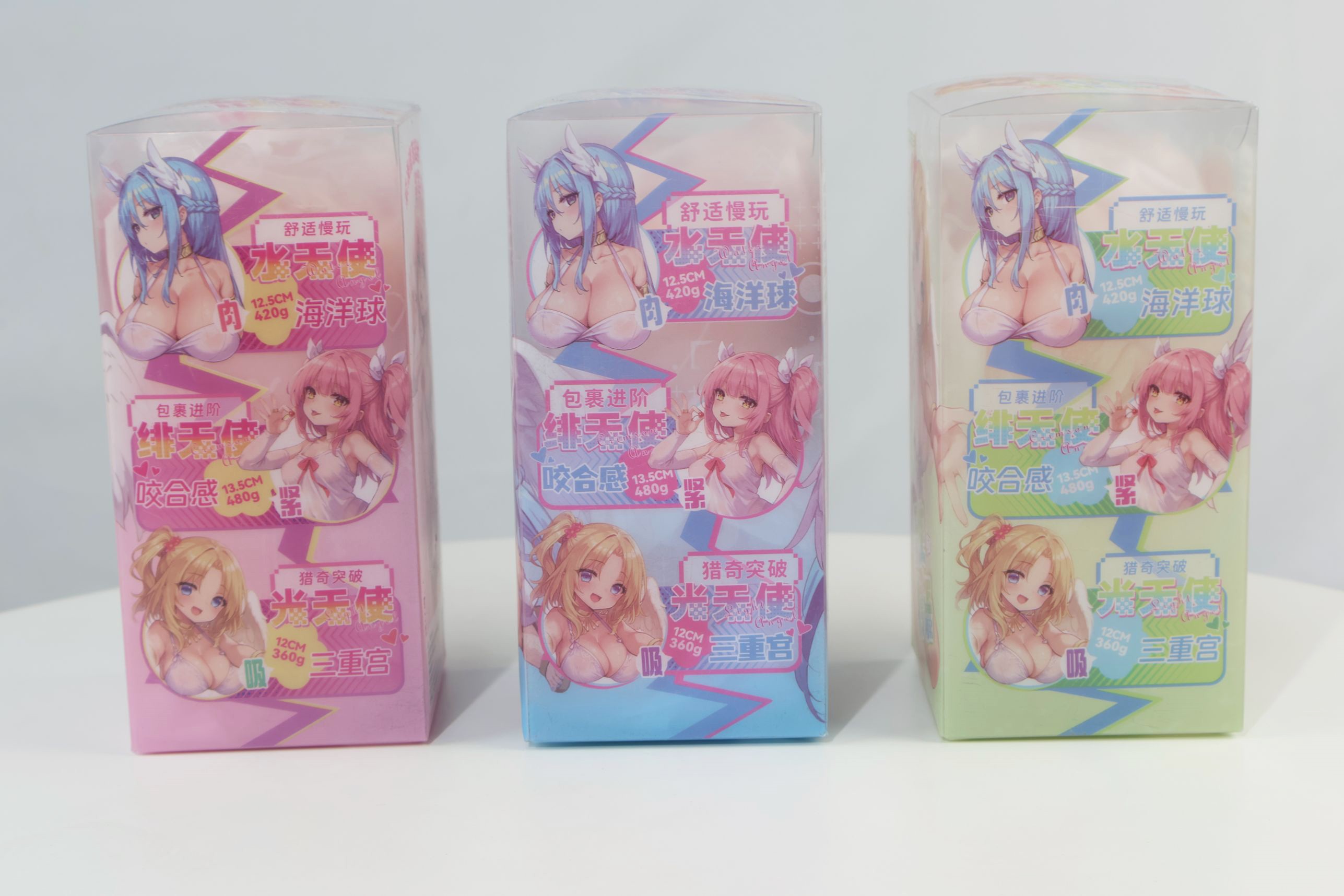 侧面包装上也简要介绍了三款产品各自的特点:【绯天使】主打的是紧致的咬合感,【水天使】主打肉感舒适慢玩,【光天使】则是主打三重宫口的突破感。除此之外,三款产品官方标称360-480g,体型十分的小巧方便。