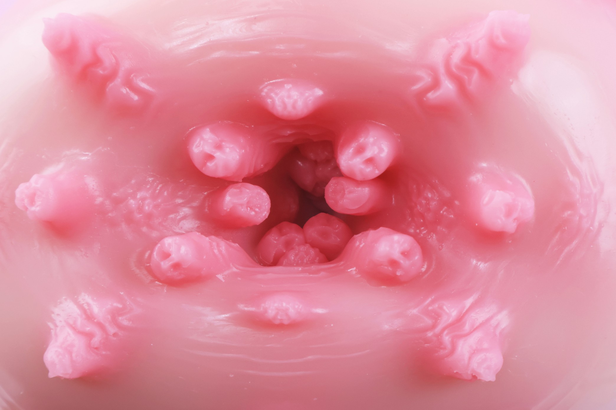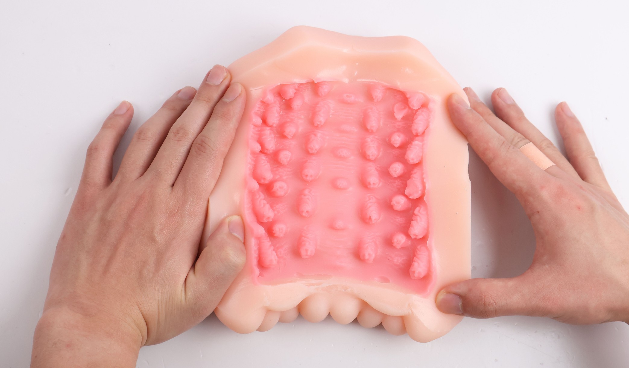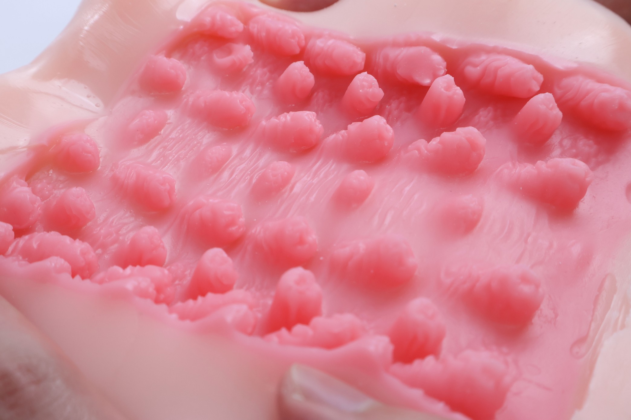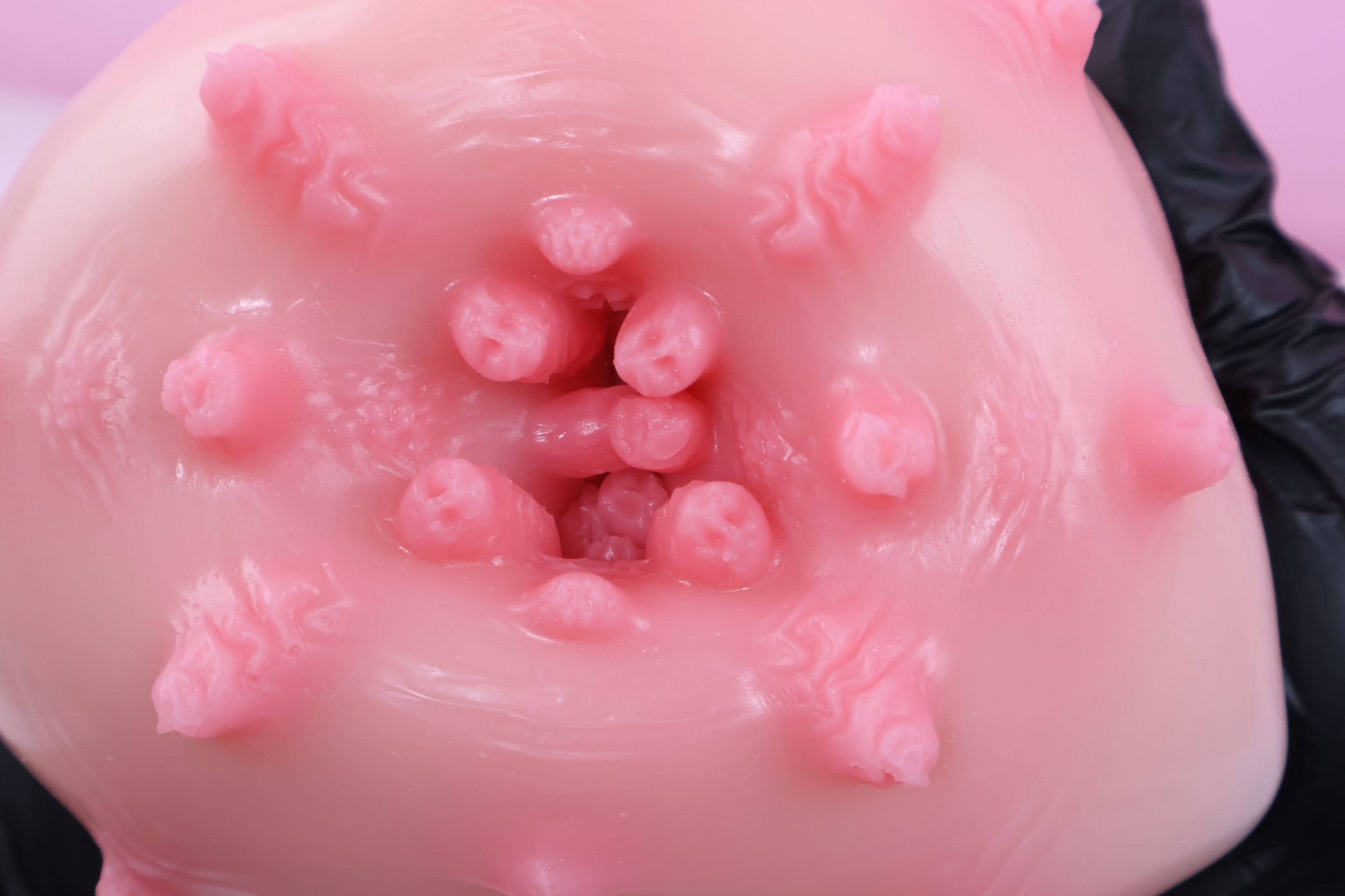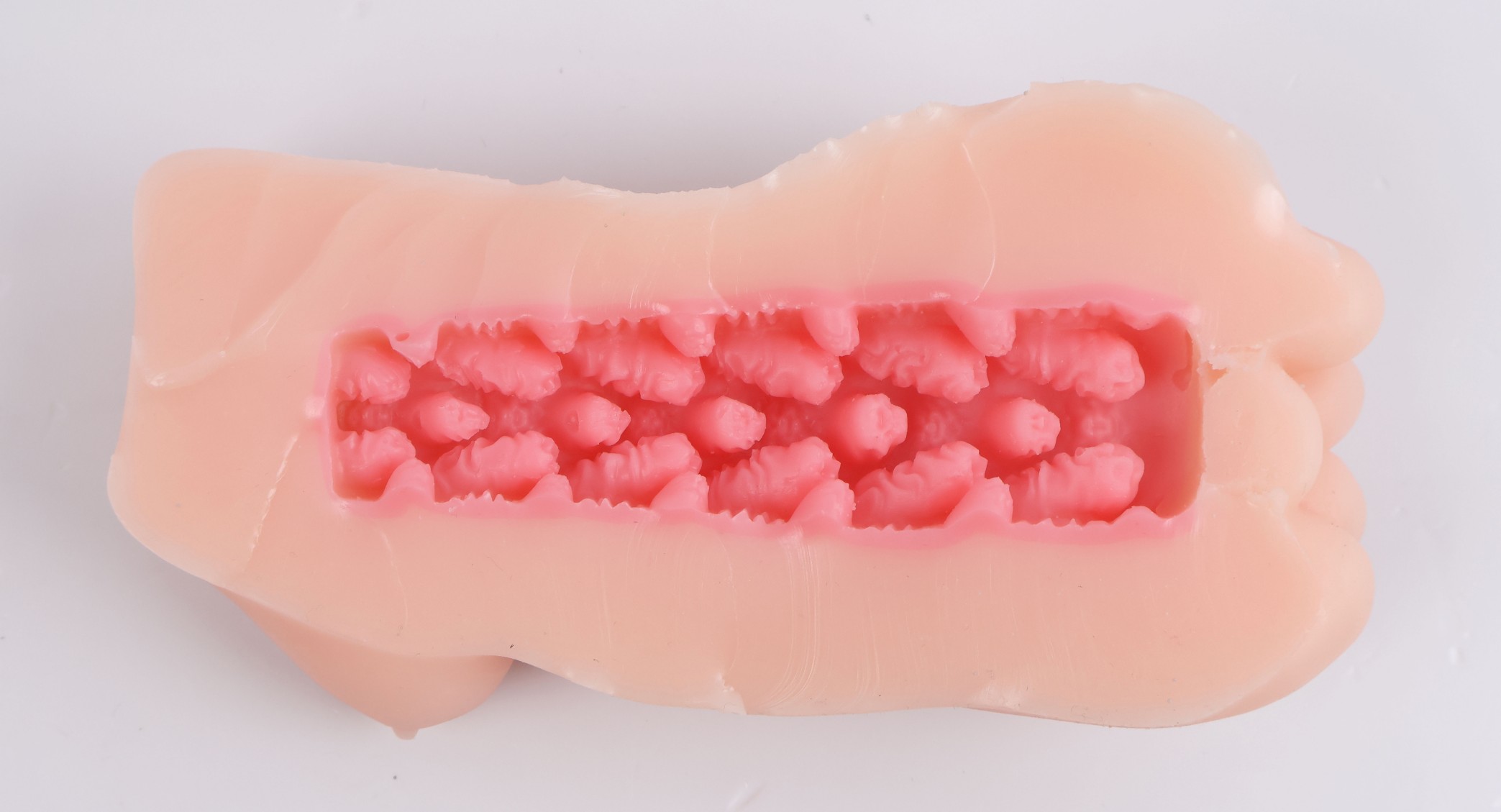 从中间沿线剪开铺平之后可以看到很多不规整的触手结构增加刺激,还有很多横纹增加舒适度,