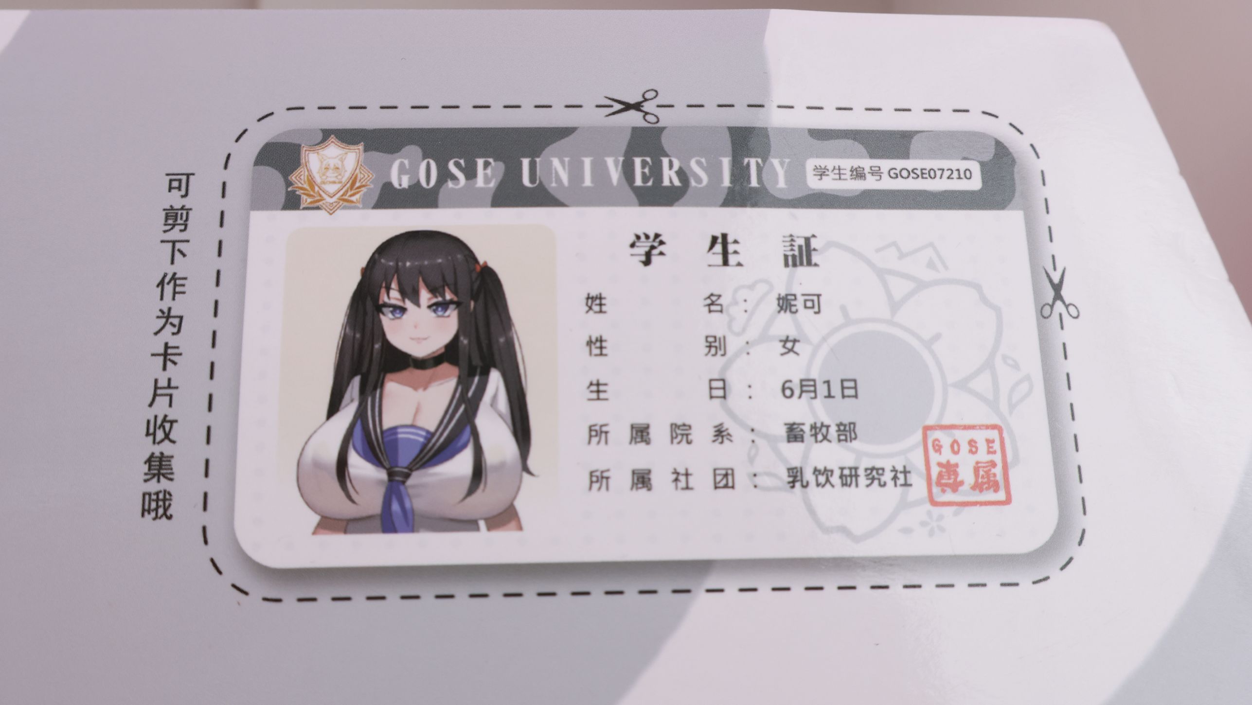 另一面展示了通道和玩法,有宫口的玩法,奶牛女仆也穿上了水手服撅起溜圆的屁股挑逗你,官方给出了桌置的正后入,坐姿女上和躺在床上女上的姿势参考,但是8kg的重量是否能舒服的床置女上仍需存疑,另外还有附赠的学生证(看起来比封绘上乖不少)