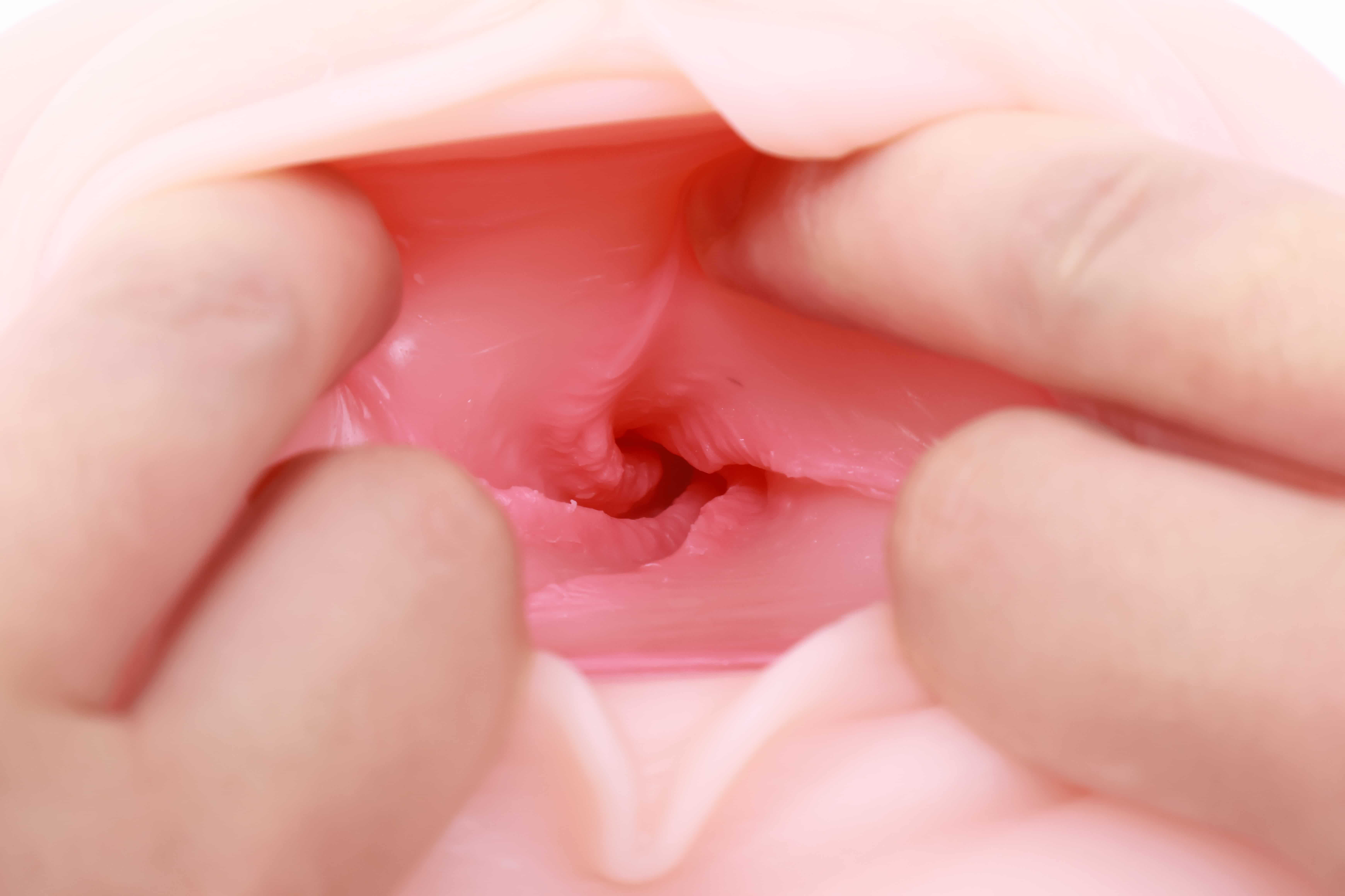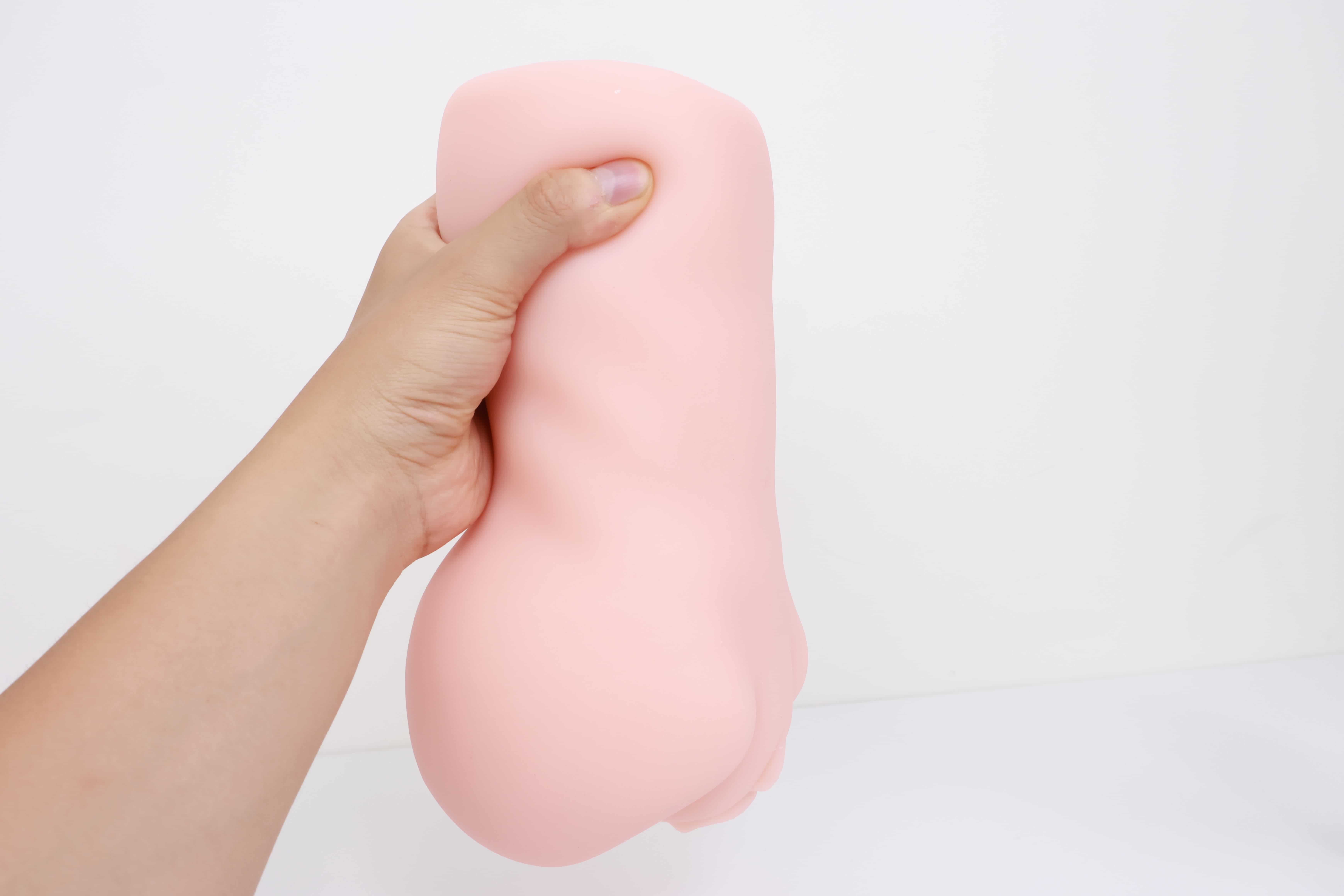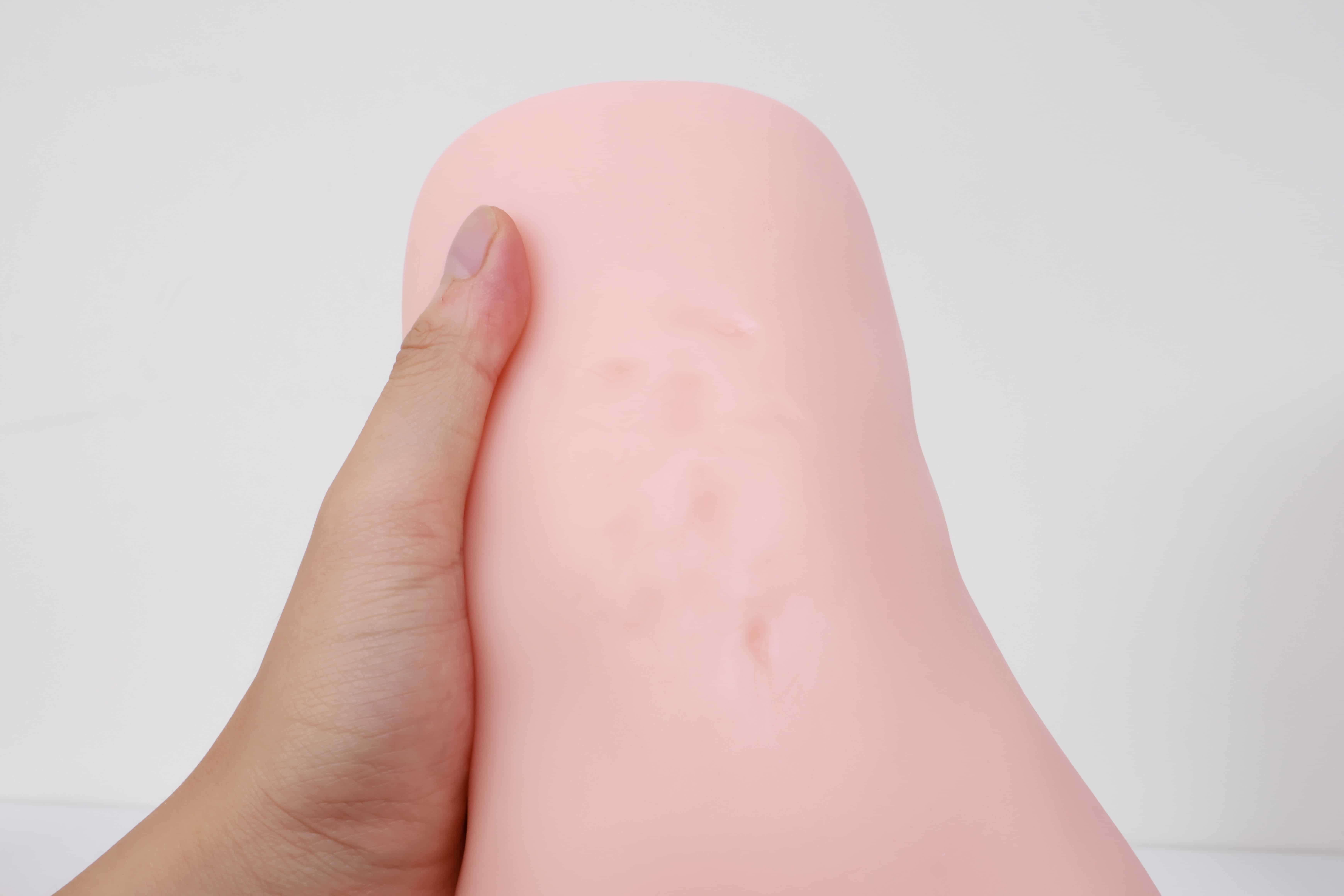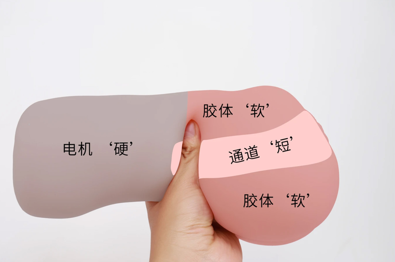 看我手卡的位置,这也是一个明显的分界线,左边就是电机,右边就是胶体,两边软硬完全不同,因为电机实在是太大了,这一部分占据了整个杯子一半的空间,冲的时候如果握到上端会感觉很硬很滑,白丝3代通道末端的子宫藏在电机内一部分,体验感不太明显。