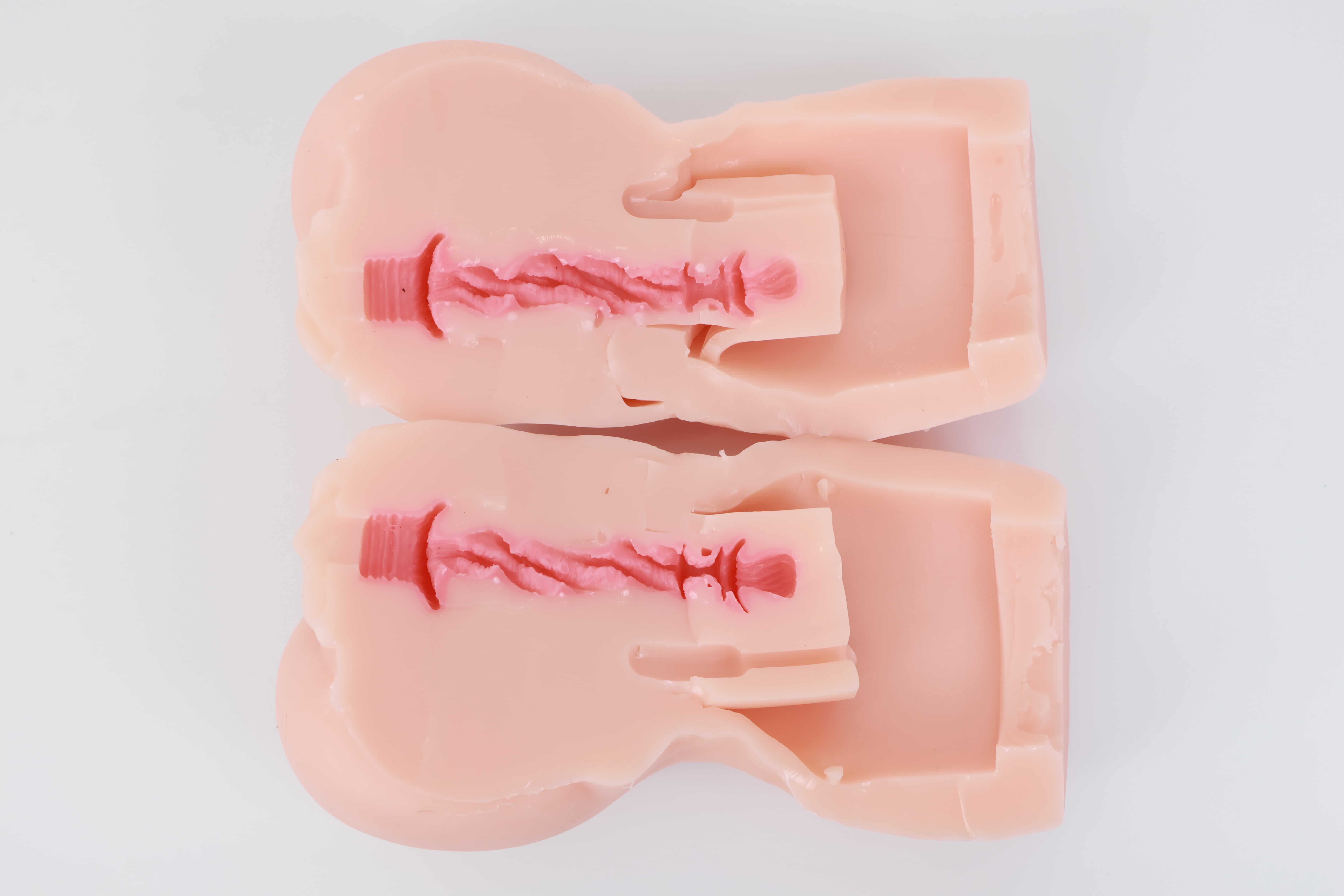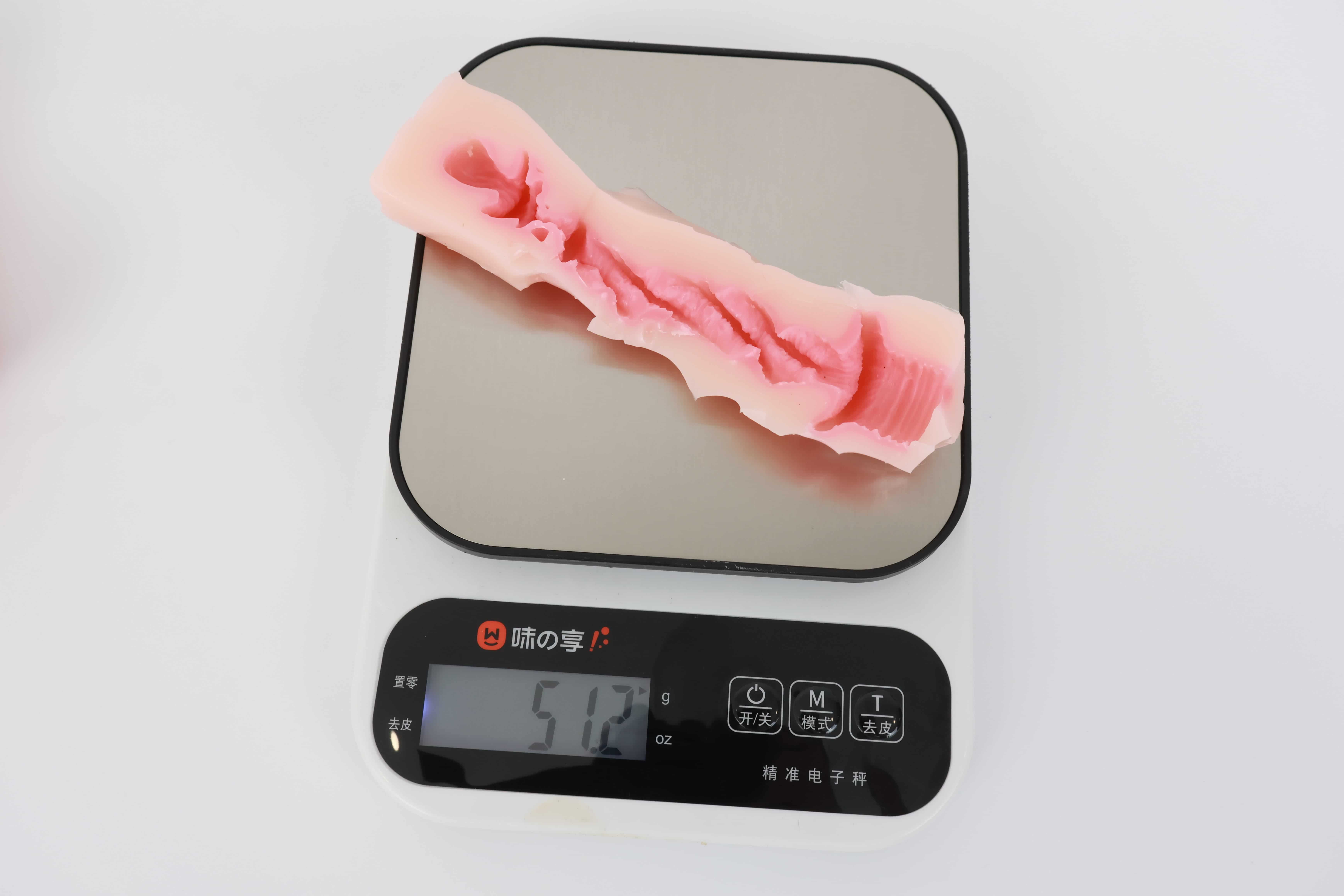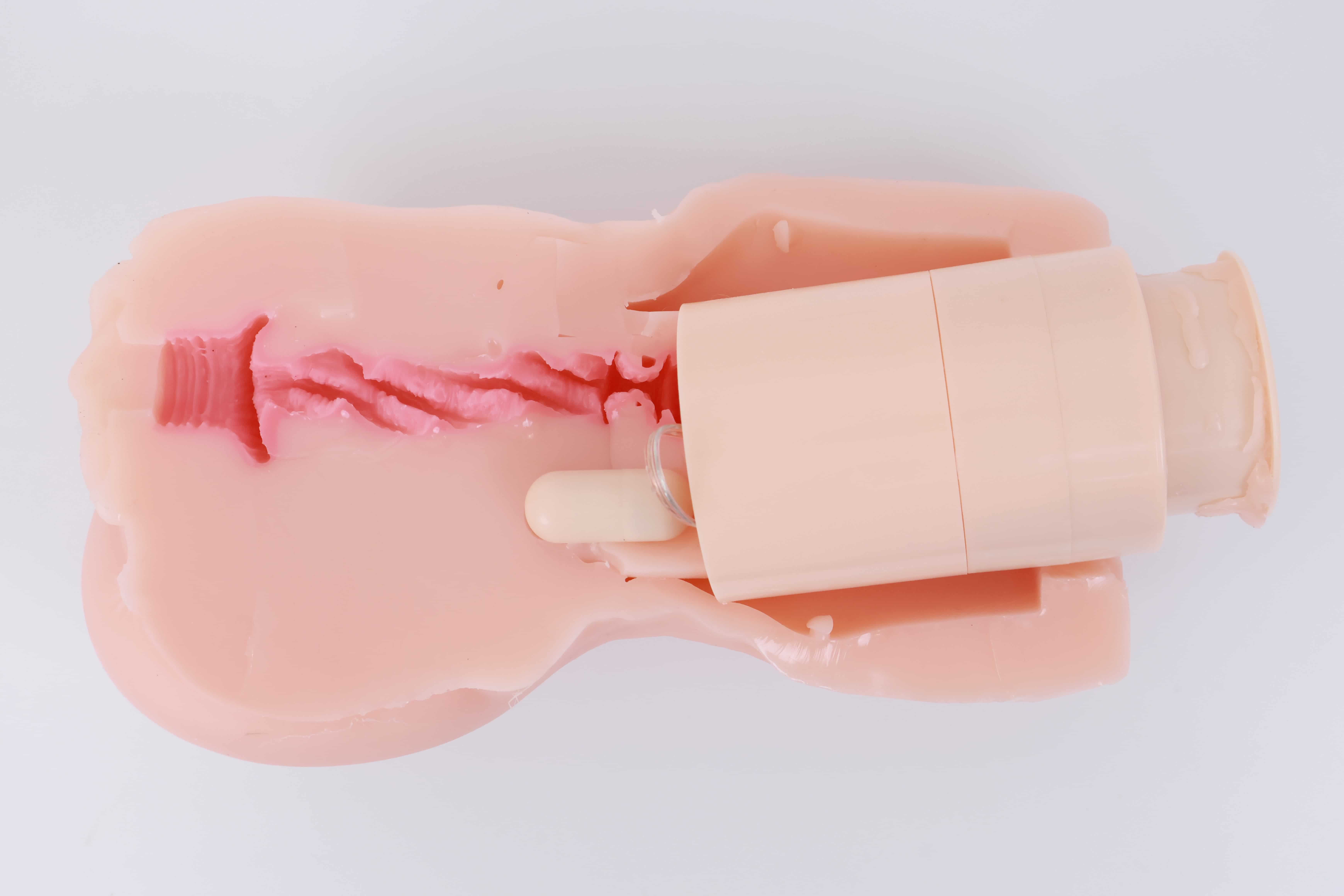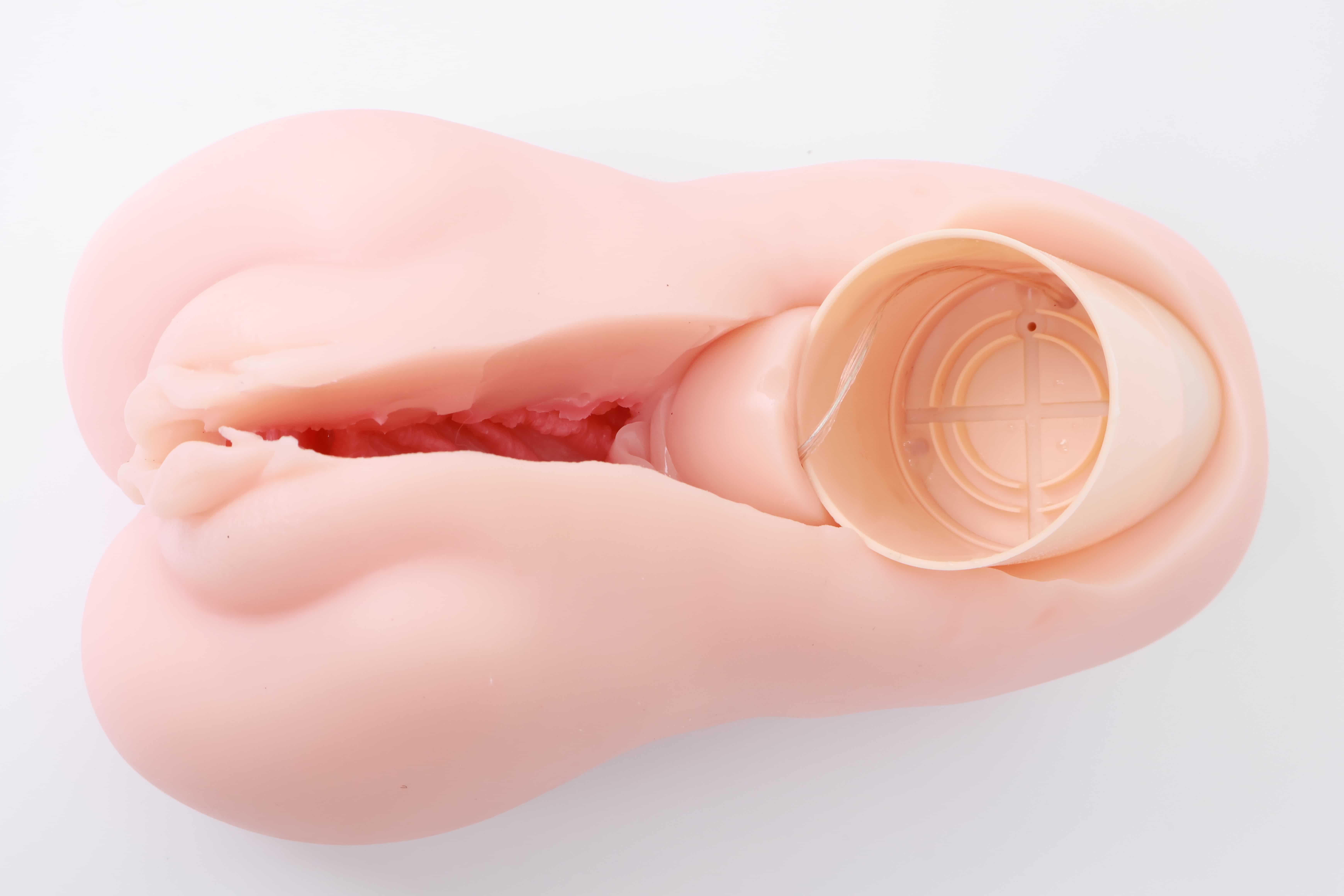对半剪开之后其实能发现这款通道并不短,和手动版的一模一样,但是因为电机和胶体厚度的缘故,阻碍了”恨塞蛋”的深度插入,所以并不能像传统手动杯那样顶胶桩基,爽感此时只能由你寻找和电机之间的默契来配合。