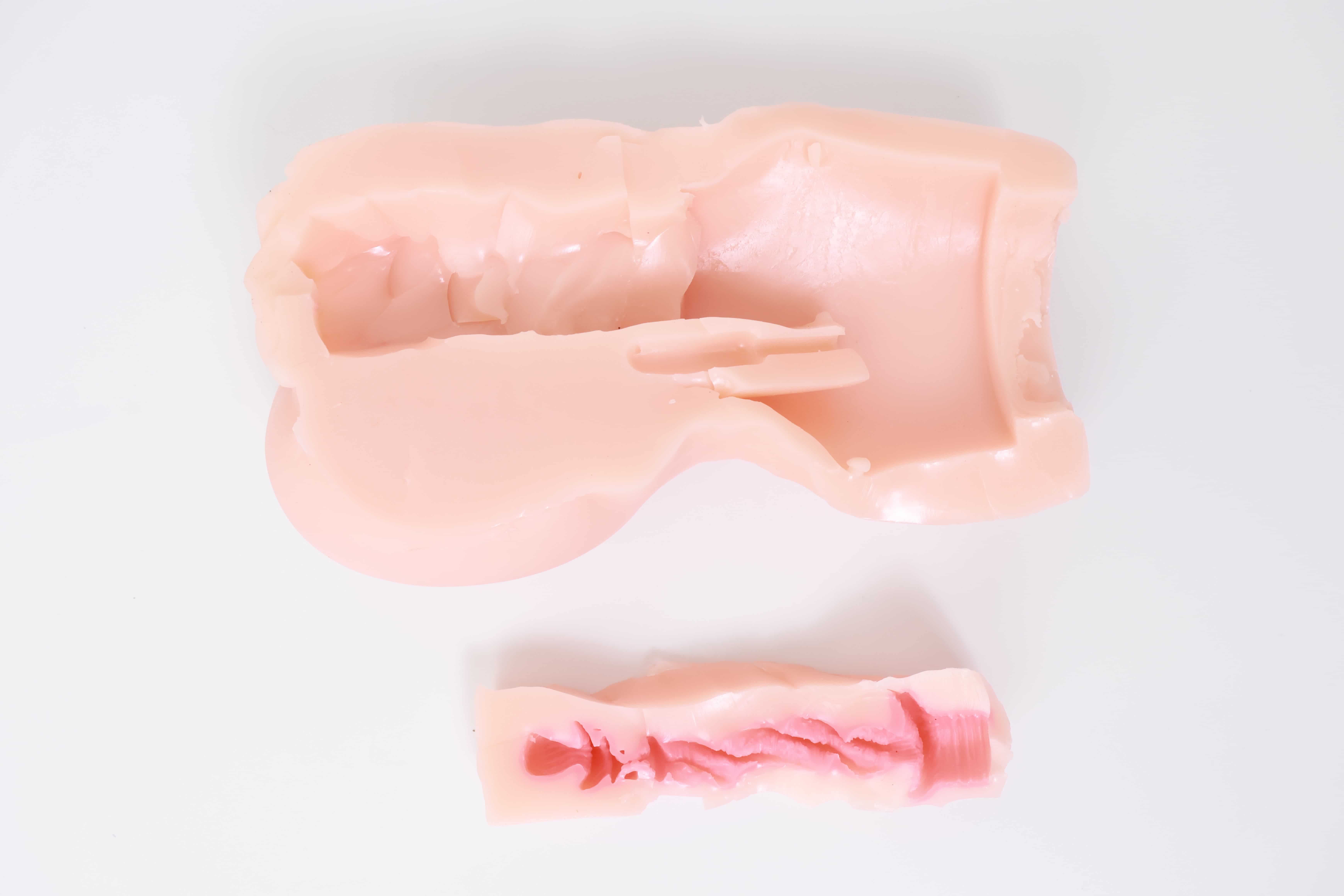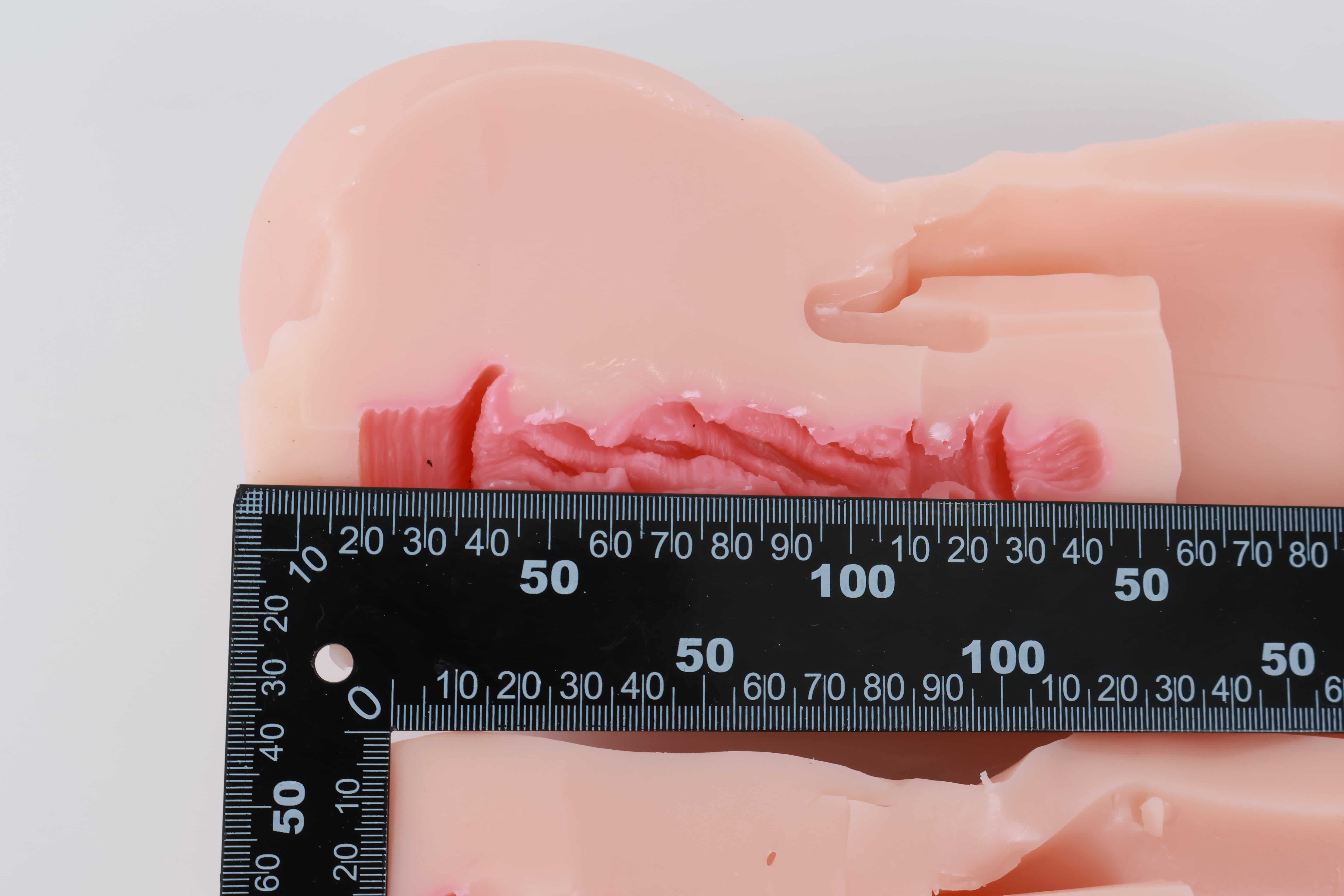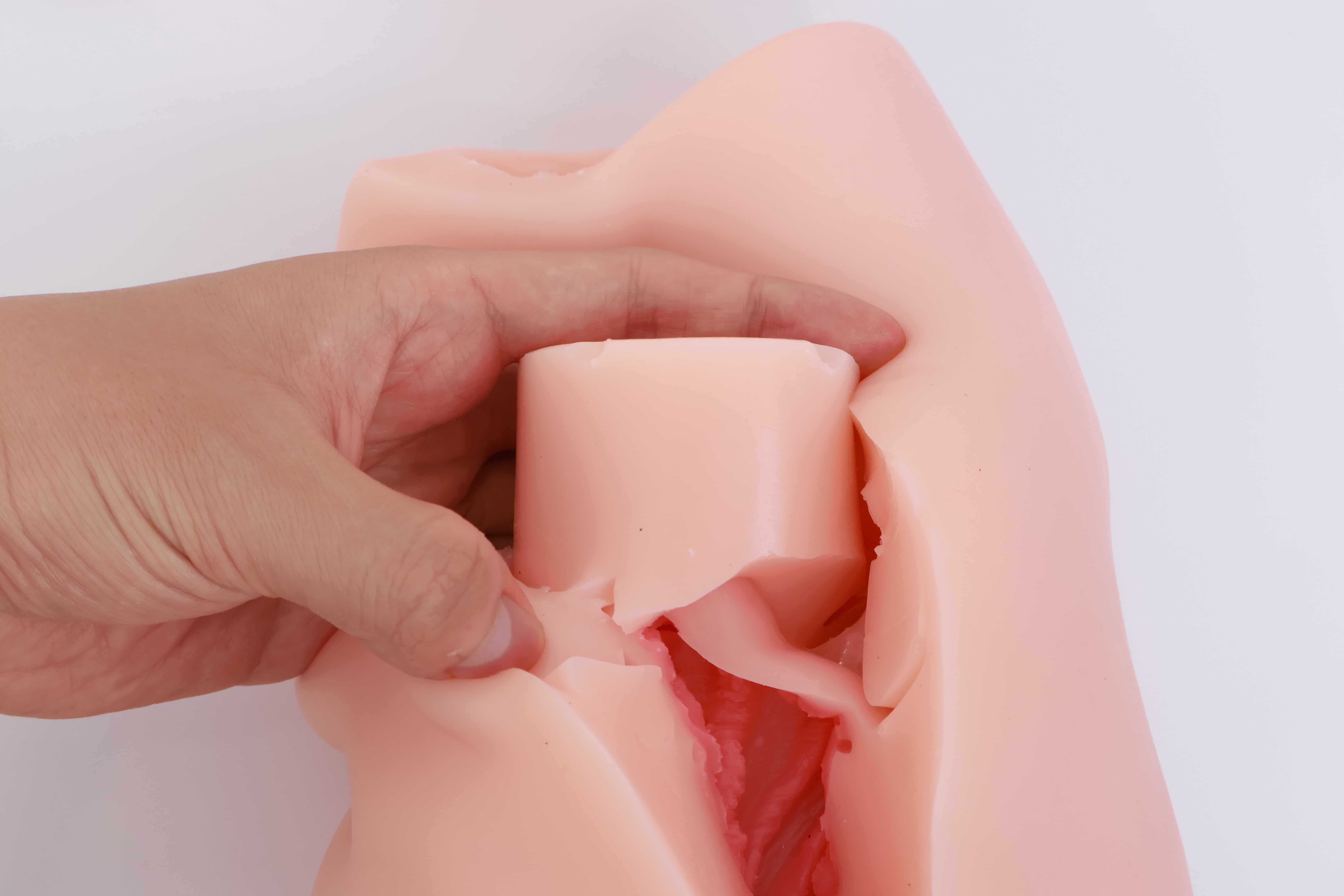 对半剪开之后其实能发现这款通道并不短,和手动版的一模一样,但是因为电机和胶体厚度的缘故,阻碍了”恨塞蛋”的深度插入,所以并不能像传统手动杯那样顶胶桩基,爽感此时只能由你寻找和电机之间的默契来配合。