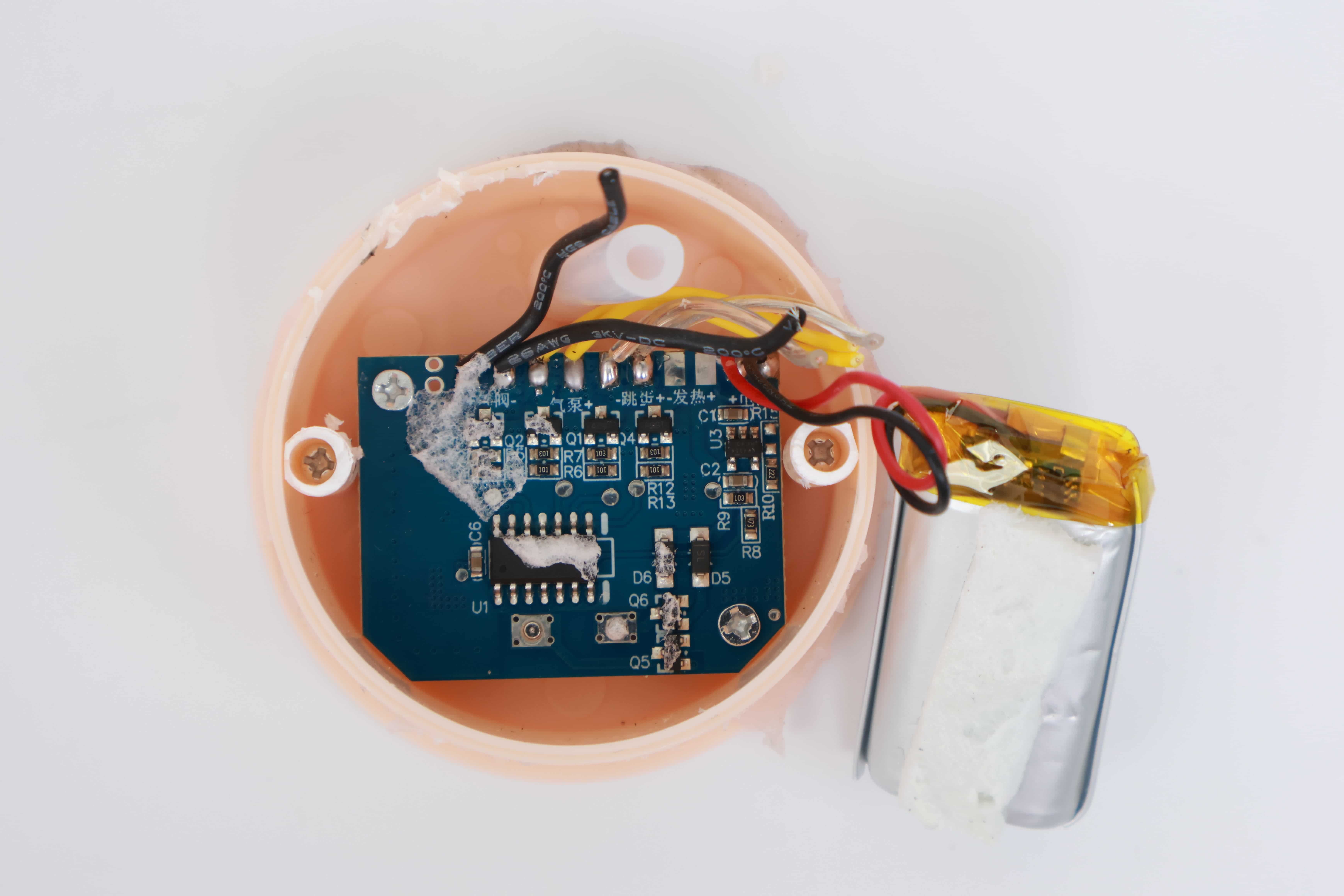 整个一套拆解下来可以看到整个电机由芯片和电池组成的”logo”区和”气泵”区组成,跳蛋则穿过整个电机区独立存在,整体上来说集成度还是很可以了;芯片上可以看到用汉字清楚的写到了有哪些功能,这里甚至还能看到发热功能的区域,不过并没有东西焊在那里,这或许是设计最初时还有发热功能?或者这个电机只是一个公模?杯友们怎么看呢!拆解白丝3电动版还让大木找到了些许童年时拆机器人的快感,这也算是个小乐趣了。
